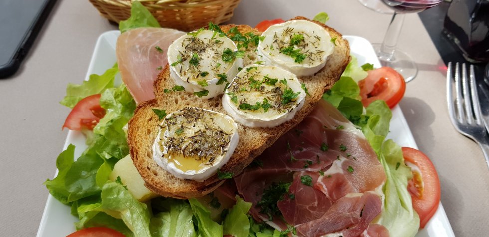 It disappoints him today though – “dry” he declares and drowns his sorrows in icecream. It’s a rare misstep: we’ve eaten very well on this trip. I, meanwhile, have my old faithful – salade de chevre. It’s not failed me yet. Creme caramel to finish. Old school, yes, but good with it.