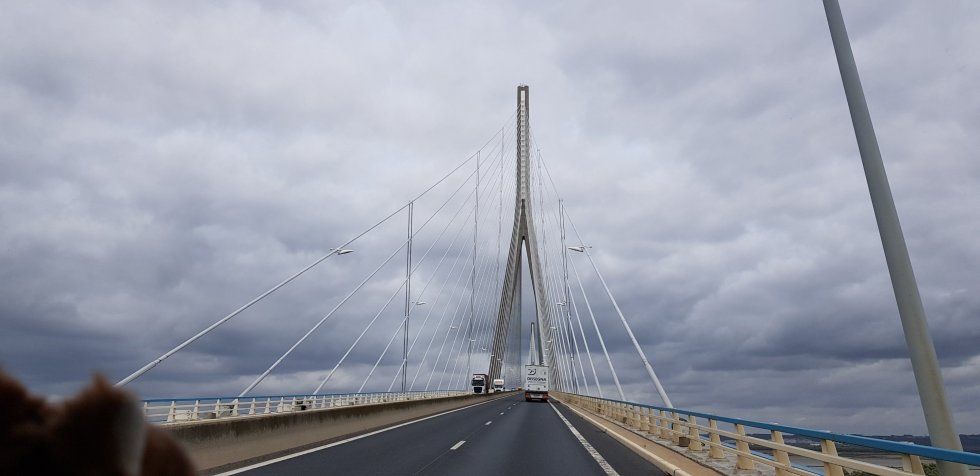 Our last views of France are familiar: the extraordinary double bridge arching over the mouth of the Seine and its wetlands bid us adieu.