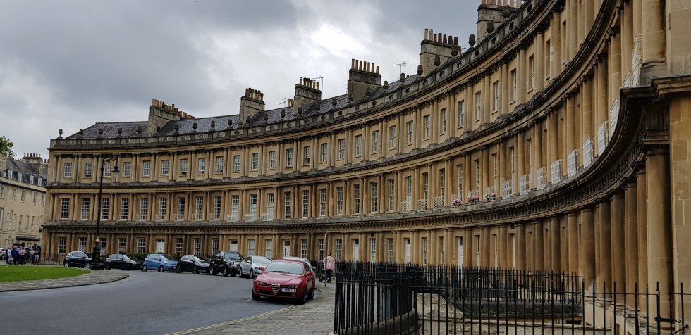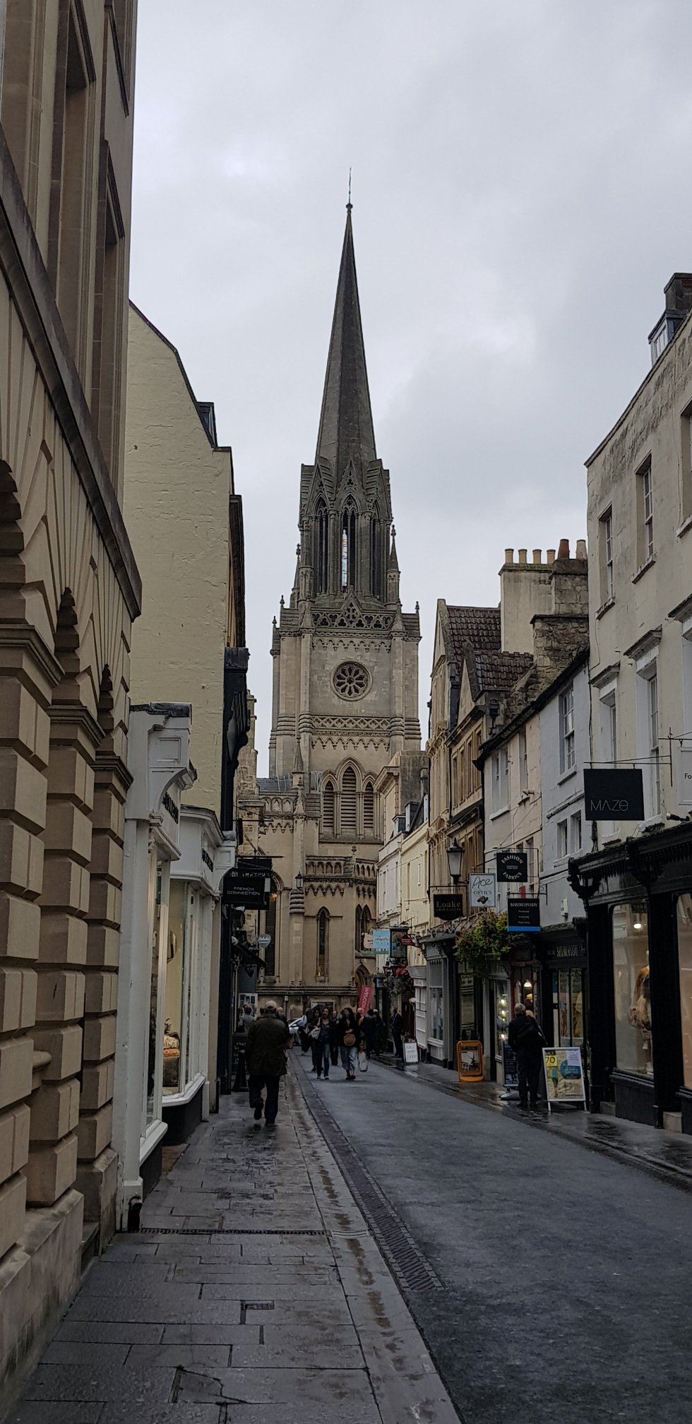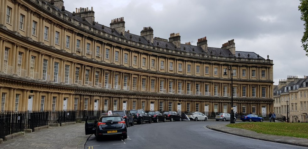 It’s a later arrival: we’ll leave the Roman Baths for tomorrow, and instead take ourselves off a wander through the city. It’s a cool, grey, drizzly day, all the better to hike up Bath’s steep streets.