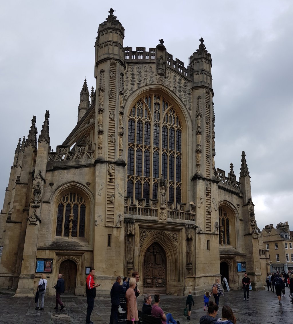 We tour Bath Abbey, built over an 8th century Benedictine monastery in the late 15th century. The Abbey enjoyed only a few decades of operation before it, along with all the other Catholic churches, was dissolved by Henry VIII. It wasn’t until late in the 16th century that the Abbey was repaired, becoming the Parish church for Bath.