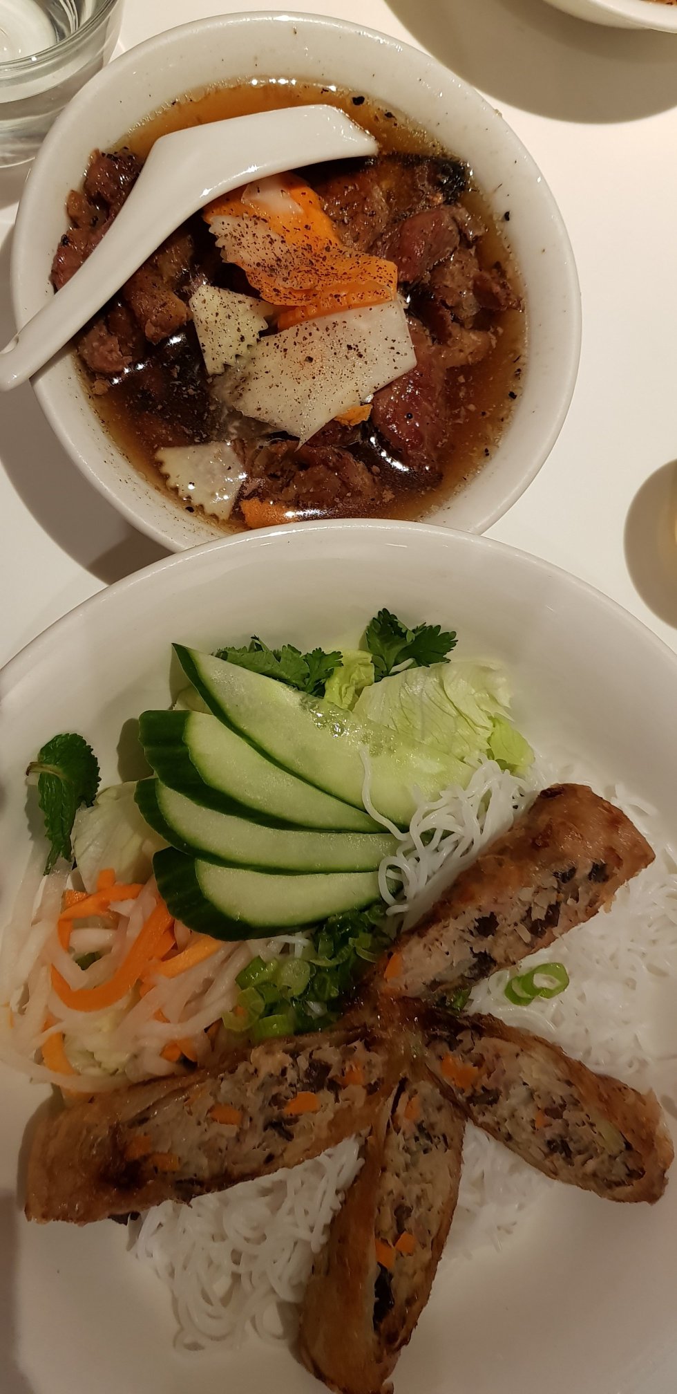 The menu is bursting with options – it takes quite a while to settle on a choice. We both have a Hanoi BBQ pork vermicelli bowl, featuring a variety of marinated pork cuts, barbecued to perfection then simmered in a fragrant broth. With a noodle salad bowl bursting with fresh herbs and a tasty spring roll, we’re in agreement – it’s one of the best Vietnamese meals we’ve had. Heavenly!