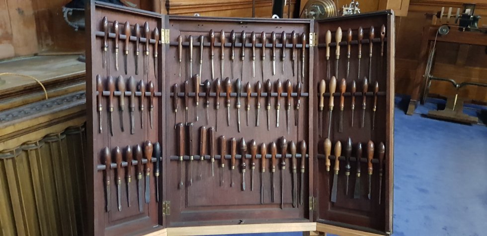 Wood features heavily in furnishings and finishes – woodturning was a keen interest. There’s even a woodturning lathe in one room and a huge array of turning chisels.