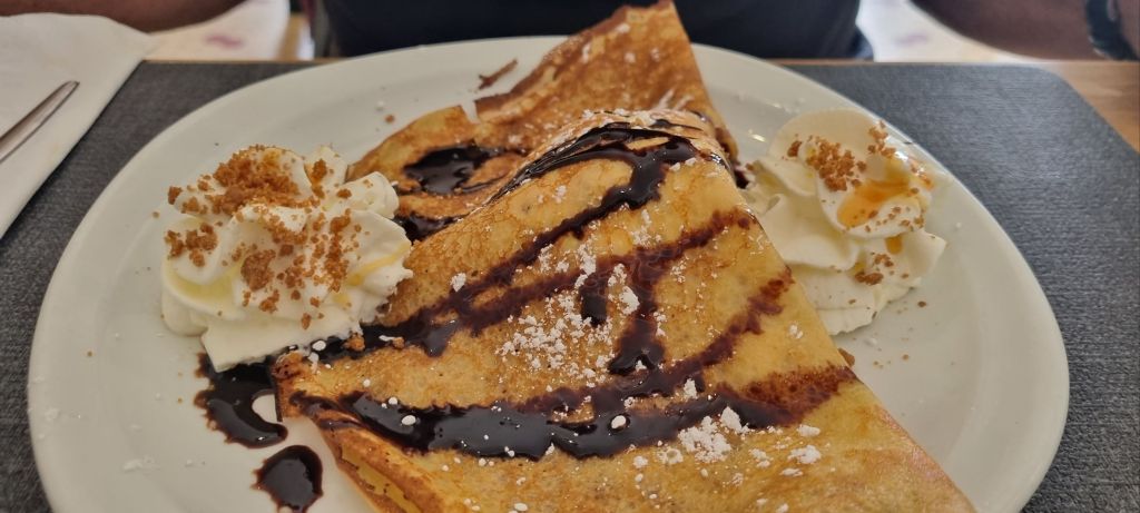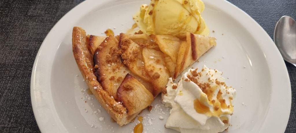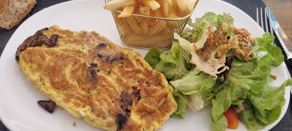 Lunch in a new spot today – a light as a feather cep omlete for me whilst Himself follows the local lads with a country soup, duck l’orange served with semolina (cous cous) and crepe filled with icecream. I prefer my tart de pomme, made of course with the Limousin golden delicious apples the area is famed for.