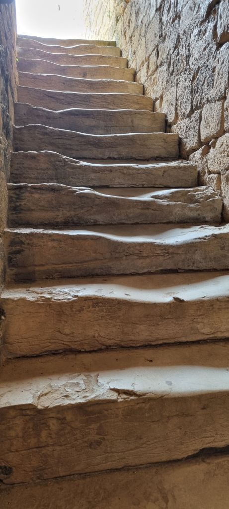 An electronic audio guide serves to tells us the story of each room as we make our way successively through the various steep levels seviced by never ending stairs, some of which are extraordinarily worn. How many footfalls must it take to wear down stone?