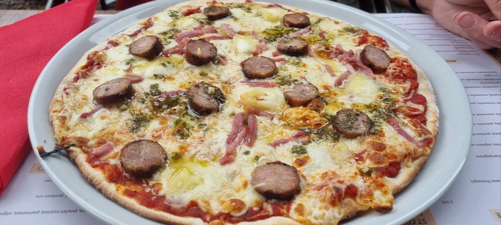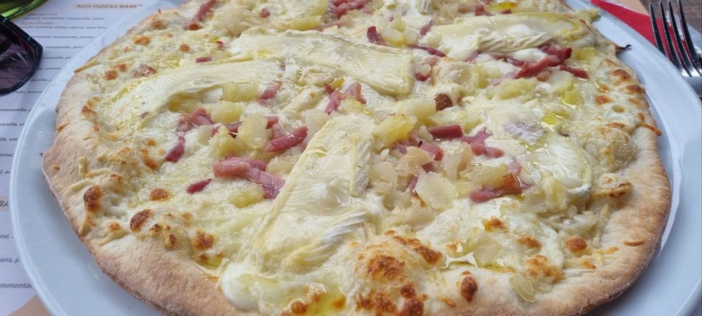 Pizza for lunch – with a French flair, of course. I have a pizza version of a tartiflette with pomme de terre, lardon and raclette, himself a Spanish/French hybrid with chorizo. Spain’s influence frequently creeps into menus this far south.