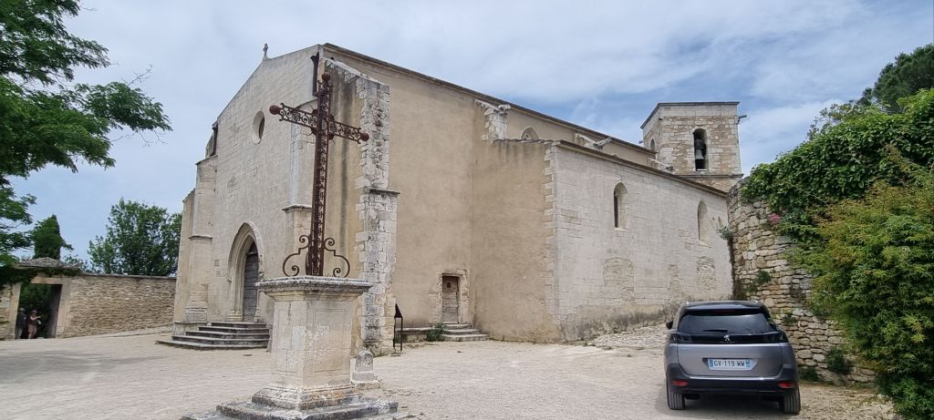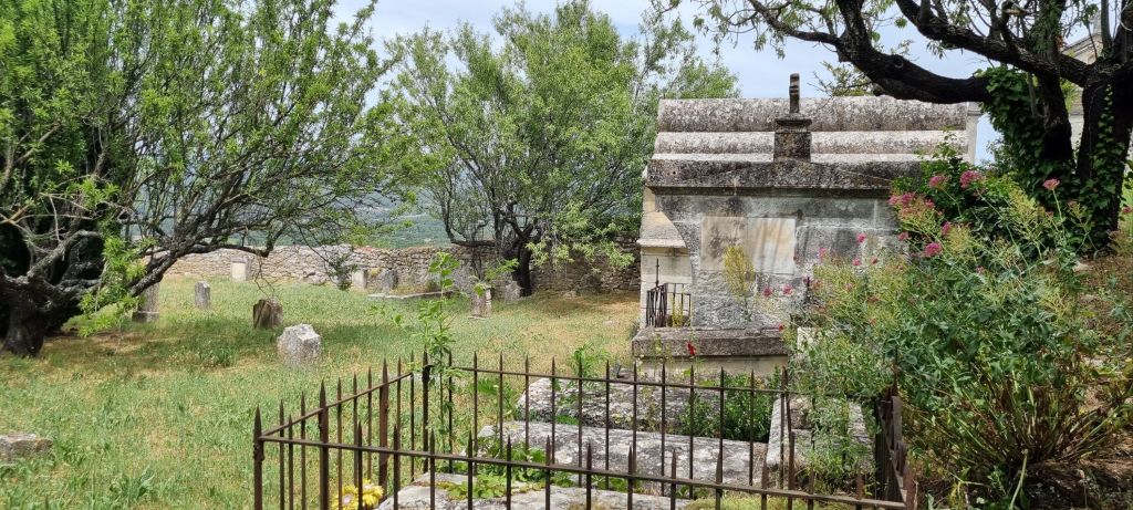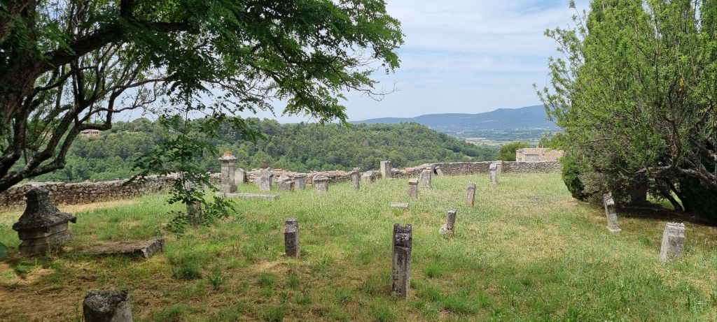 The business of lunch over, it’s time to explore. Menerbes is set into the side and atop a Luberon mountain, inhabited since prehistoric times.  Endless views on all sides.  A meandering path takes us to the summit, site of  the 16th century Eglise Saint Luc, unfortunately not open. Set alongside is an ancient cemetery.