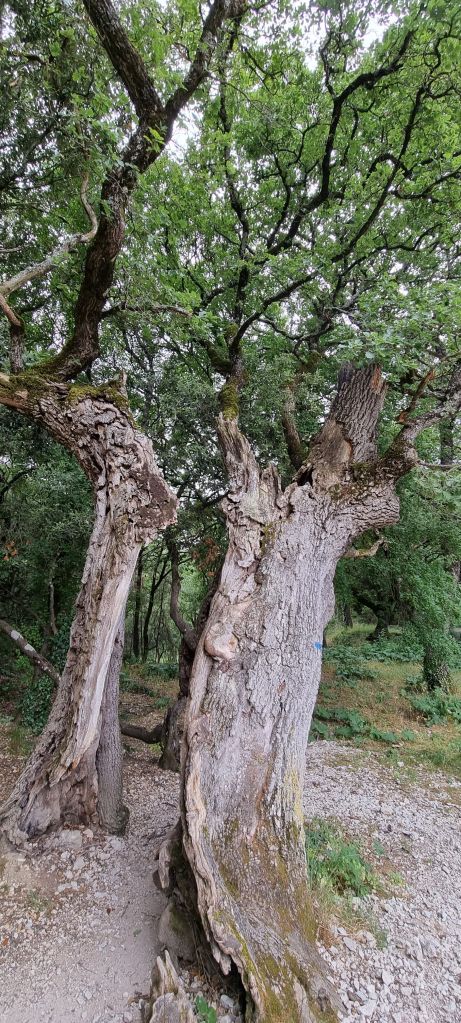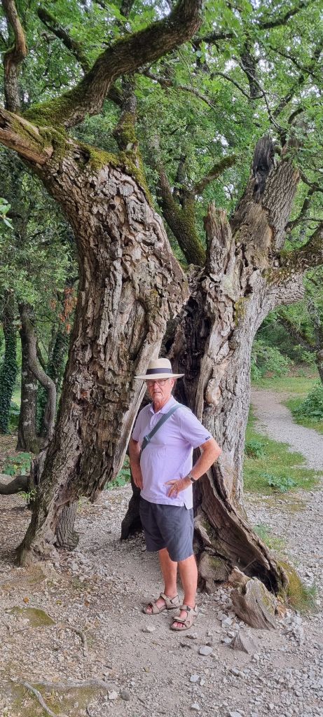 We find an ancient oak tree, split into two and somehow, extraordinarly, still thriving. It’s a mesmerising magic trick. I would love to know its history.