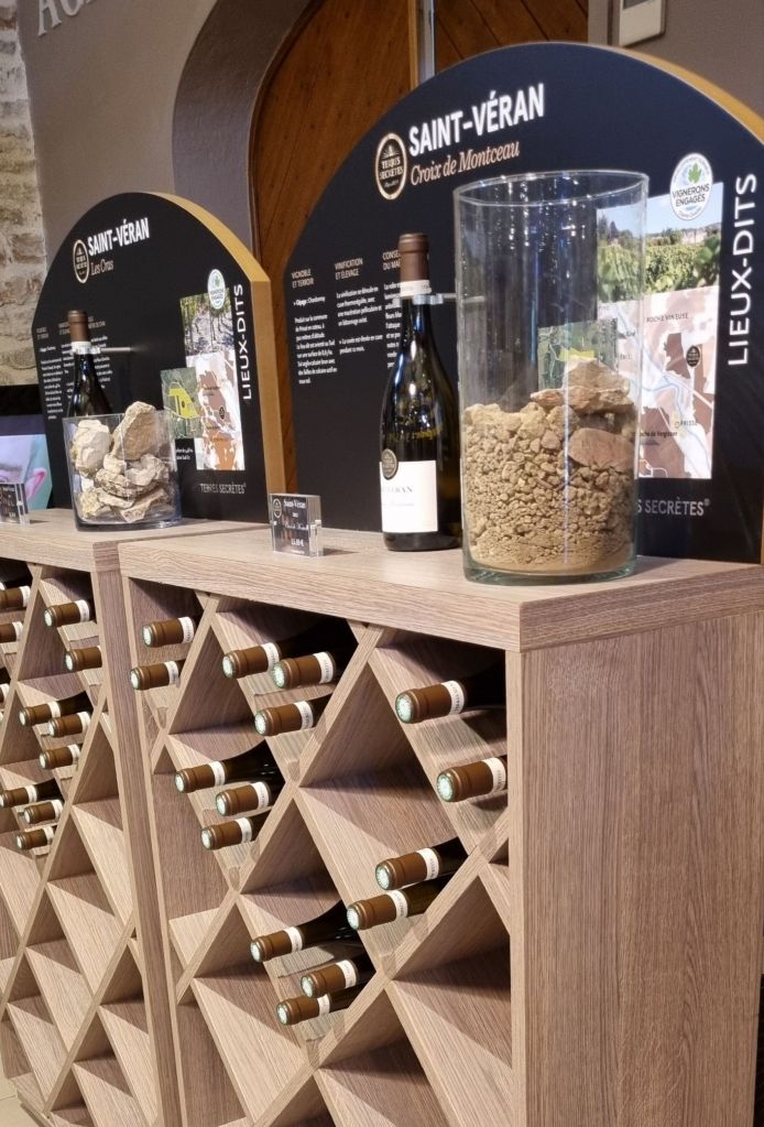 Each wine is showcased with its awards, growing conditions, tasting notes and interestingly, a vase of the earth the grapes grew in. There’s quite a remarkable range of soil and rock types – the French take terroir very seriously in wine making.