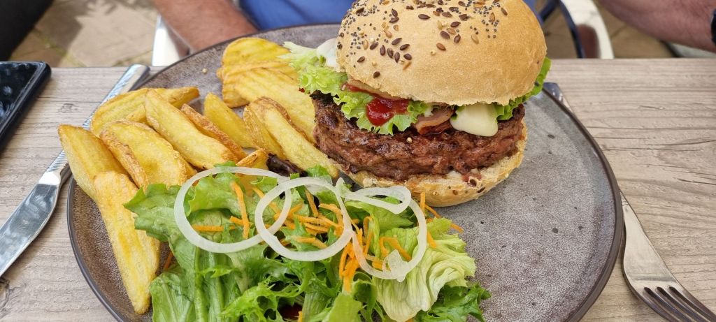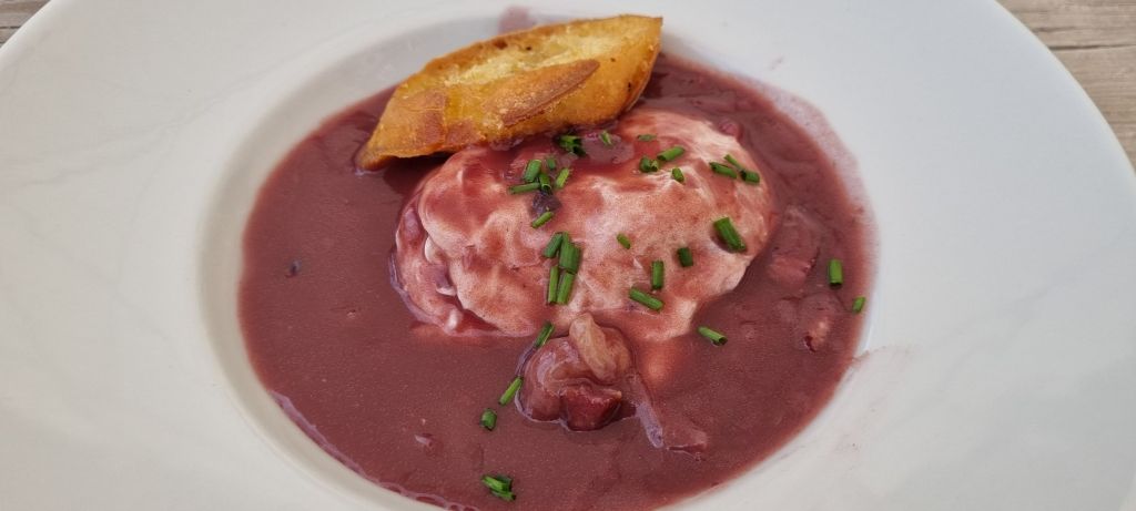 Himself calls for lunch so it’s here we stop.  A burger for him.  Ouef muerette for me – farm fresh eggs poached in red wine, lardon and just a kiss of shallot.  Utterly delightful.  I first had this dish decades ago, in a restaurant freshly crowned “best new restaurant” in Melbourne.  Mushrooms in that version, reduced to intensify flavour and baked in copper.  I thought I’d died and gone to heaven.  Himself meanwhile, has a childhood mortal fear of soft eggs.  How sad he’ll never know their joy.