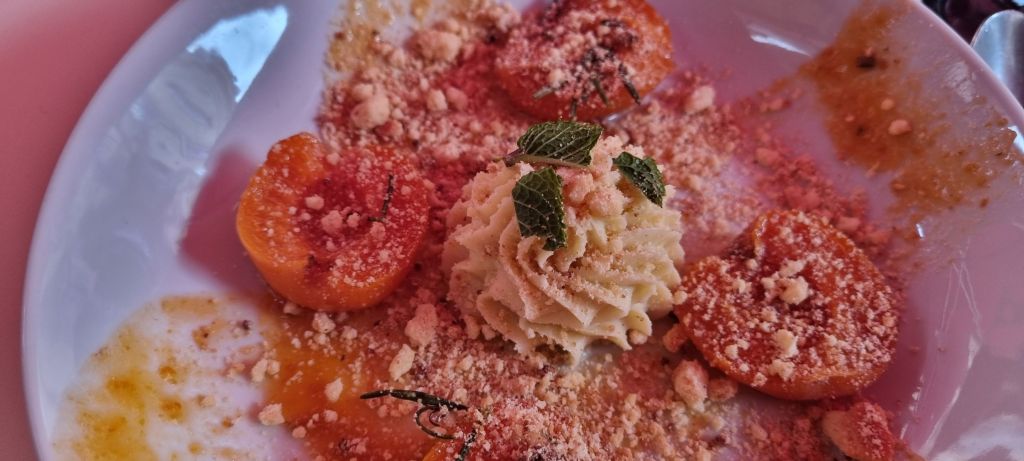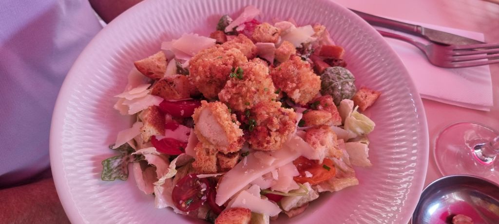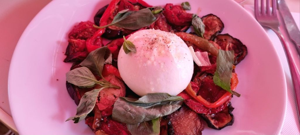 In amongst it all, we manage a lunch where Himself actually orders a salad. Very out of character – perhaps I’d better check his temperature? Cesar for him, with chicken but I think I make a better choice with a burrata, basil and roasted vegetables. Roasted apricots for dessert. (Red tinge from the shade umbrella)