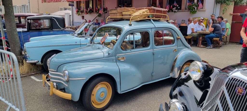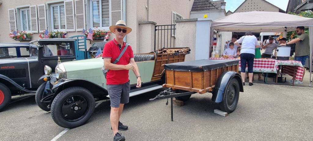 It’s Bastille Day and although we’ve left Egiusheim’s festival behind, its party atmosphere follows us. Enroute in Bennwihr, it’s a triple celebration – there’s an antique car show in the main street and it’s also the anniversary of the village’s WWII liberation by American troops.