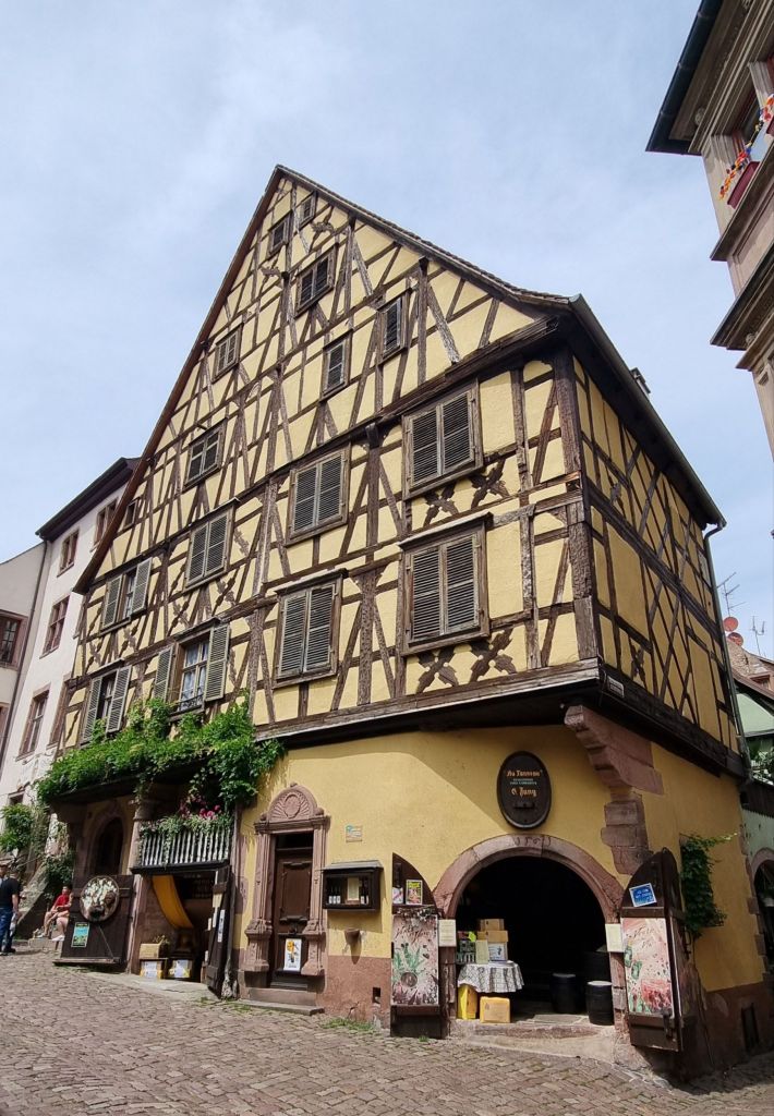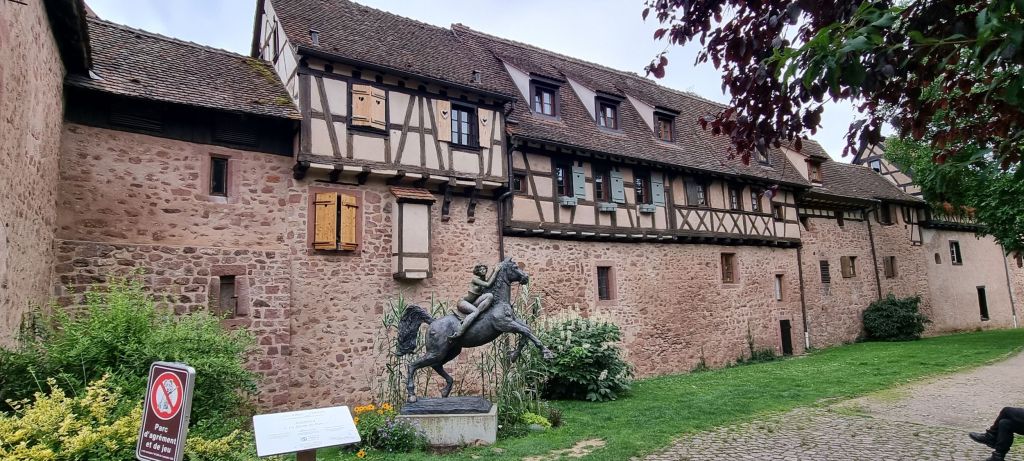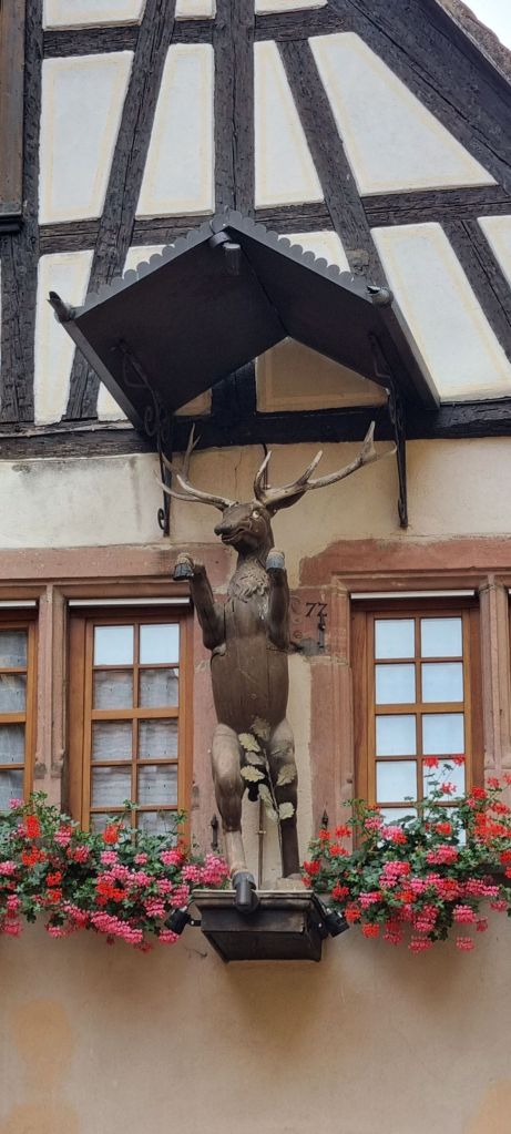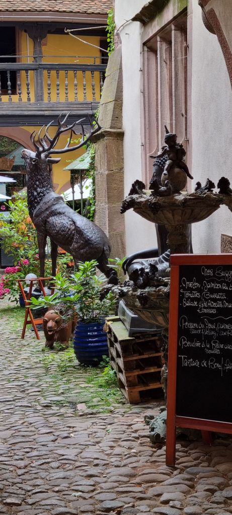 Back on our day’s focus, Riquewihr isn’t far, only 16 kilometres on from Egiusheim. Referred to as the ‘pearl of Alsace’ it’s easy to see why. Unlike its circular counterparts, the village is set out along a steep main street with houses soaring on both sides. They’re grand, with colourful half timbered frontages, exuberantly overflowing flower boxes, central courtyards and painted ceilings. We have to believe our guidebook on the latter, but we do catch a glimpse of a private courtyard, complete with deer sculpture (below).