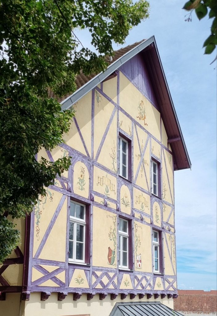 An enormous half timbered bell tower sits at the top of the main street, behind which are the remnants of the original fortified walls and drawbridge. Unwanted visitors would have a hard time getting through that enormous handspan width door, even if they managed to get through the moat, fortification wall and drawbridge.
