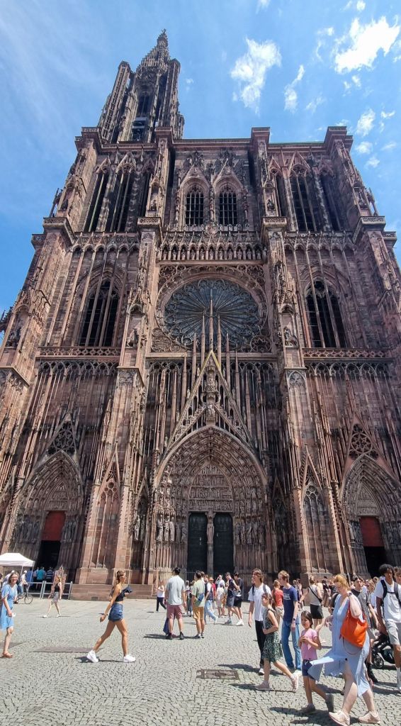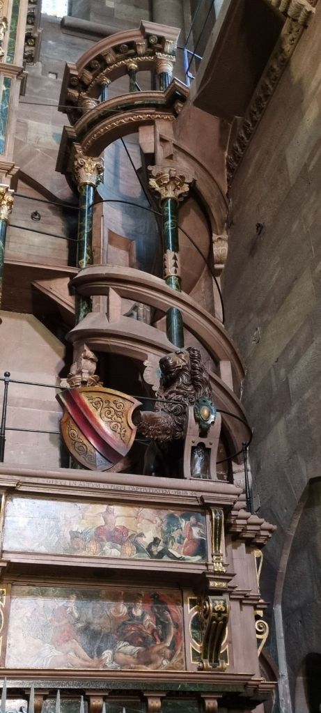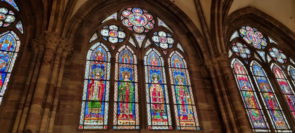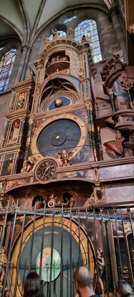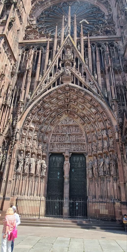 We wander for a while then stop at the Cathedral with its enormous 142 metre spire – the highest in western Europe until the 19th century. Made from pink sandstone between the 11th and 16th centuries it’s Strasbourg’s central landmark. Incredibly ornate, inside and out. As always, it’s hard to do it justice to enormous places in pictures. The light’s against me, which isn’t helping, washing colours out rather than enhancing them.