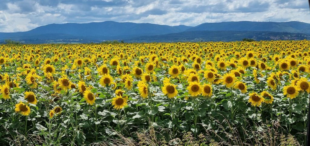 Having lost all the distance we gained yesterday, Himself replots our journey northwest. We spend most of the rest of the day driving. Thankfully the countryside is gorgeous. Farmland with corn, wheat and sunflower fields which help to calm frayed nerves. There’s even a field of garlic.
