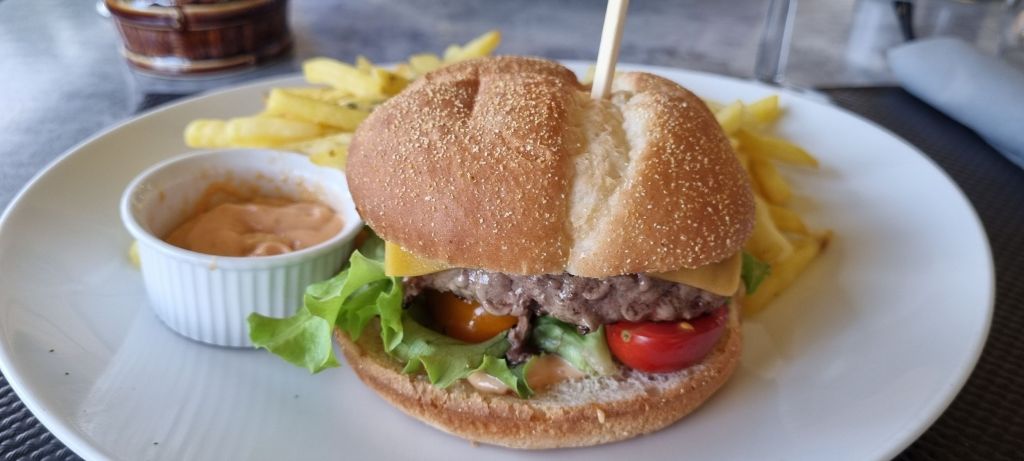 There’s a cafe on site (too hot to ride into town = too hot to cook me thinks) so it’s naughty burgers for dinner. That’s my polite one – Himself has a double. His reasoning? It’s only one that has bacon on it. Hmmmm. This little piggy went to Verdun…