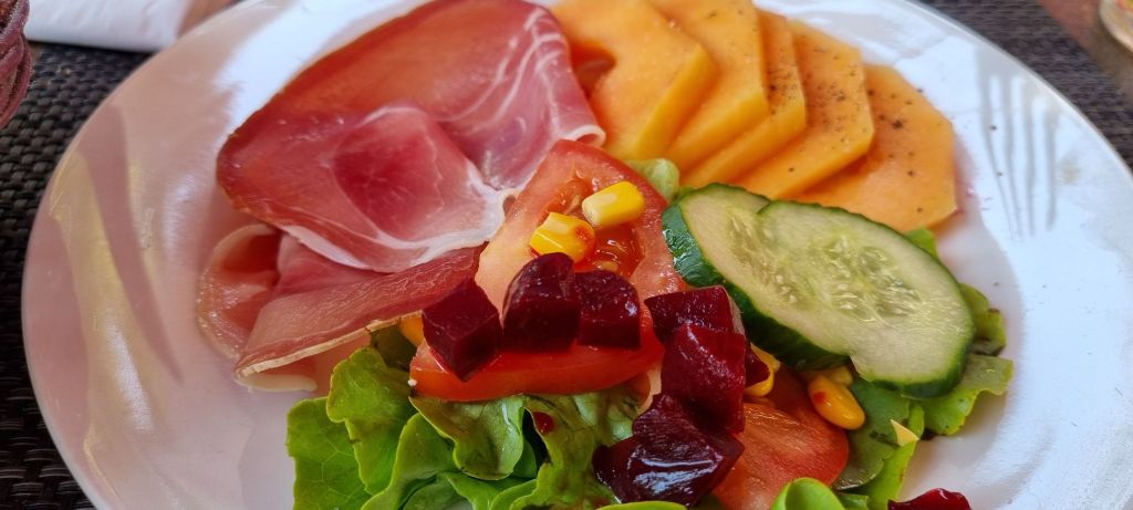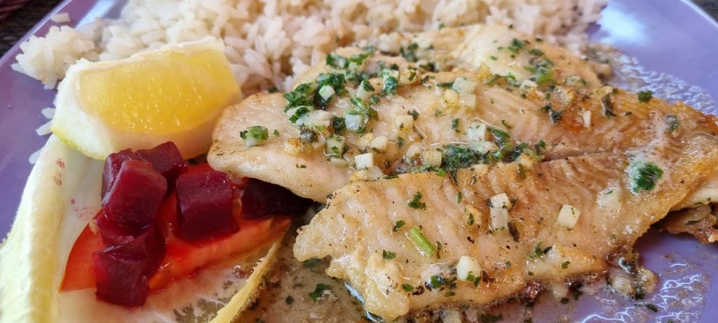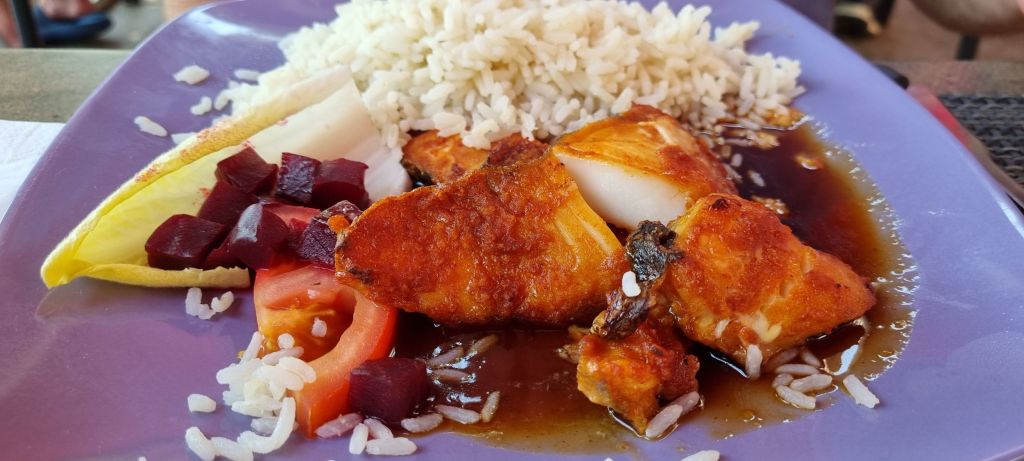 He’s soon selected – fish for a change. Melon and jambon cru followed by cod in a sweet and sour sauce for him. Lemon sole meuniere for me. Divinely buttery and garlicky. I’ll have to master that recipe.