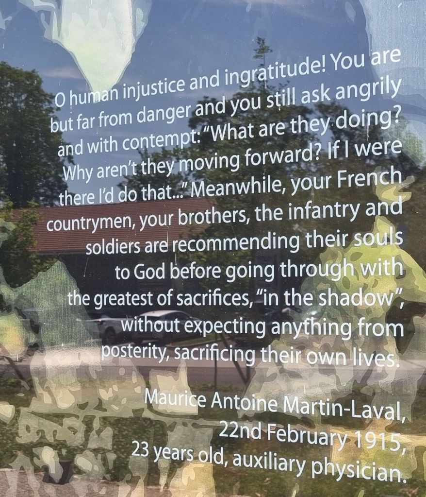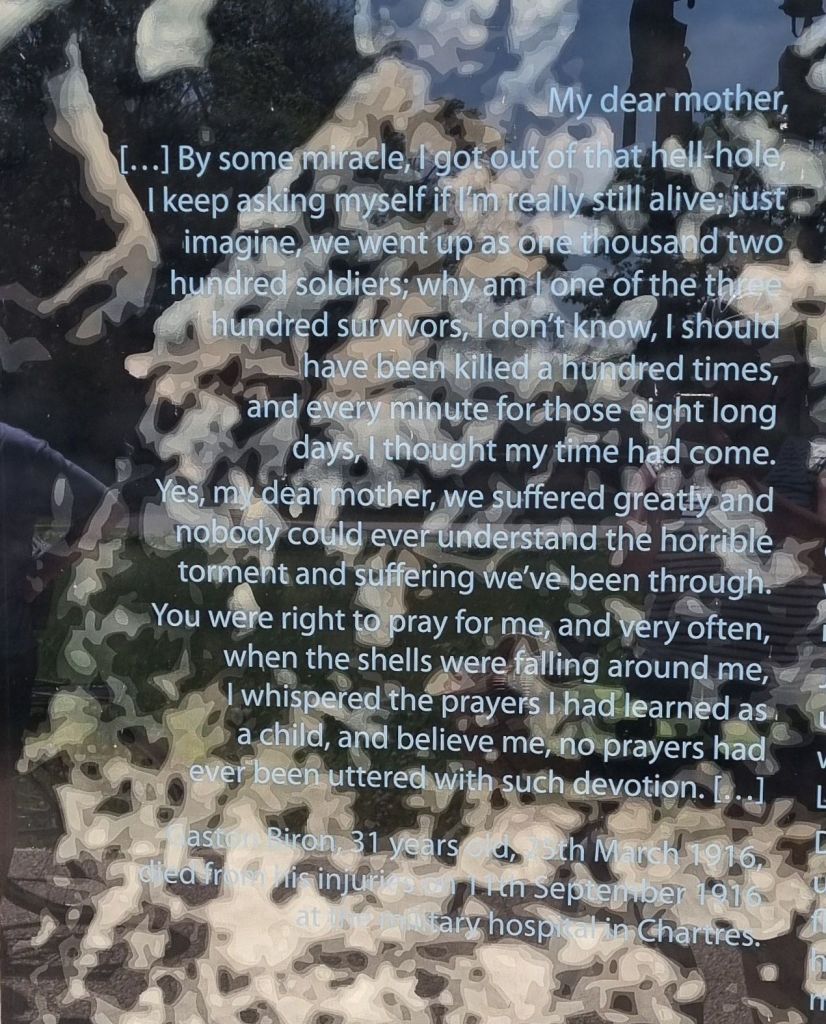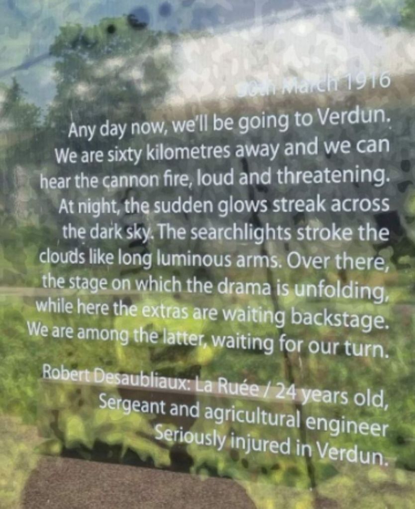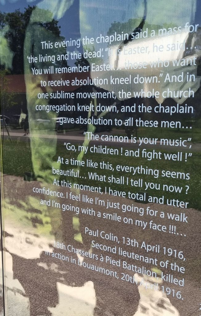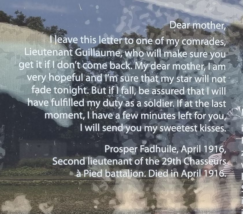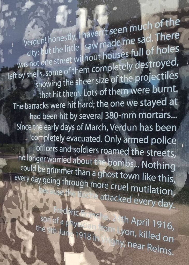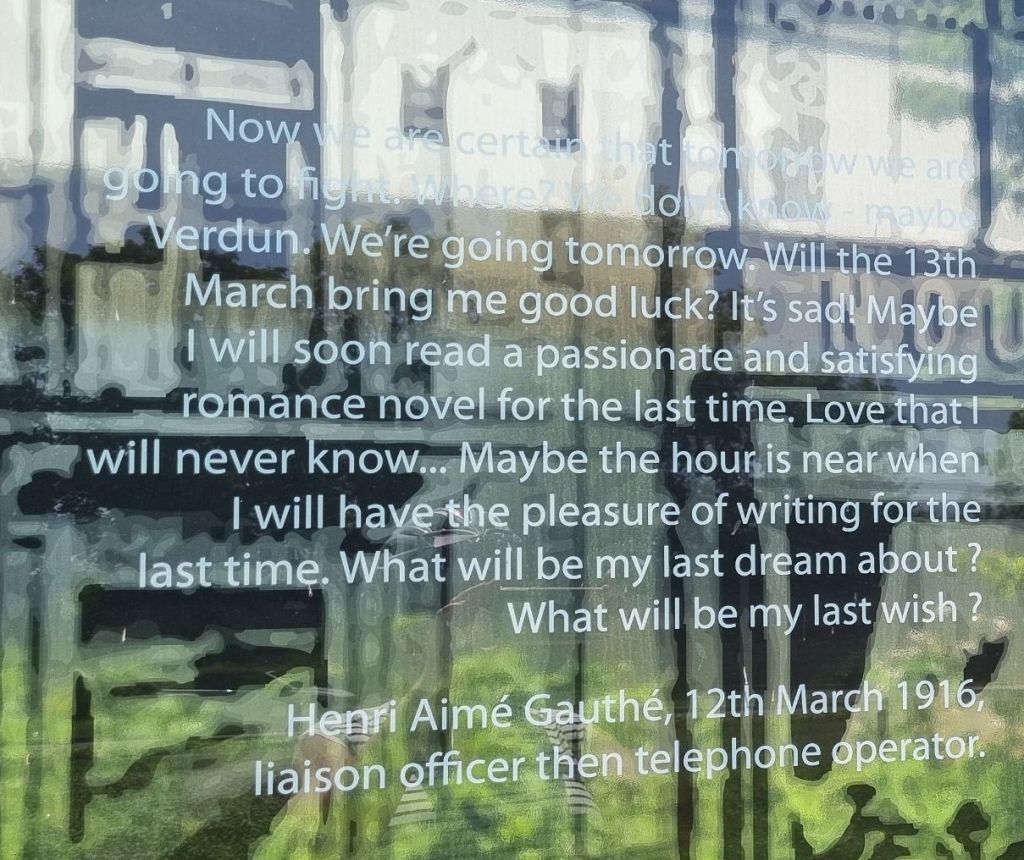 Before we head home, the citadel’s new entrance has to be explored. It’s very well done – a series of glass panels linked by photographs and letters transcribed in French, English and German. They’re incredibly moving and I’m soon sobbing. Hopes and fears are laid bare. So many didn’t survive. I urge you to read them – they humanize loss in a way monuments cannot The pictures can be clicked into and enlarged if needed.