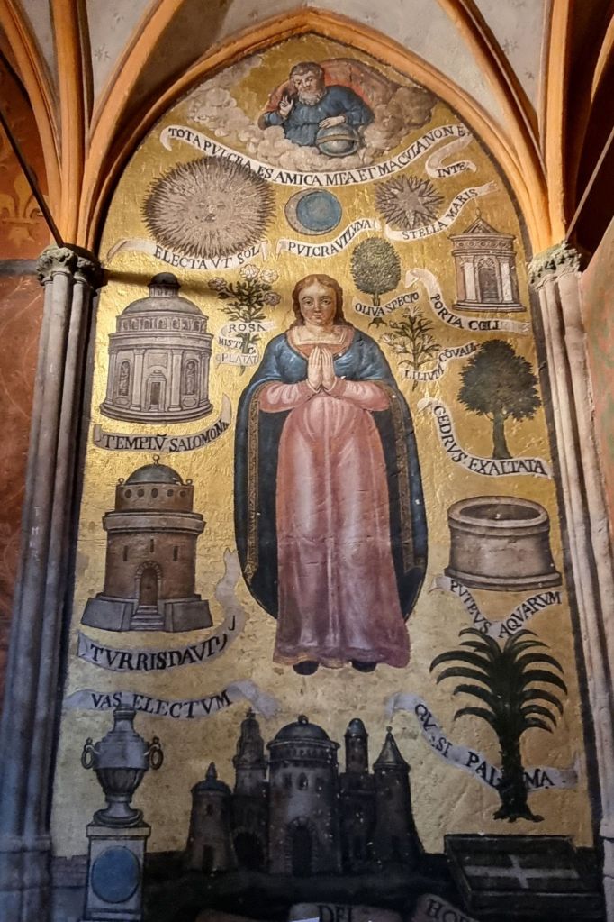 The Basilica is just as glorious inside.  Stained glass windows soar on all sides, indispersed with chapels painted with medieval frescos and decorated with beautiful sculptures. Medieval churches can be quite a colourful affair.