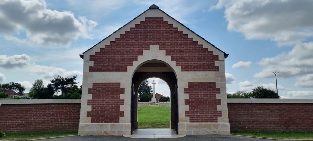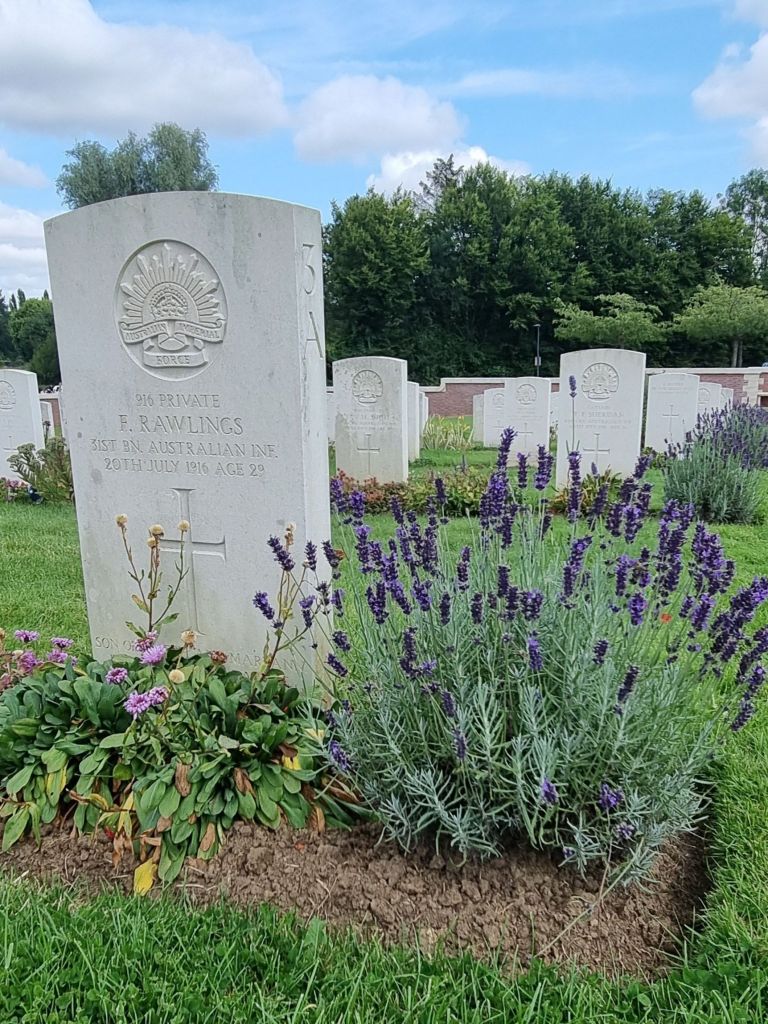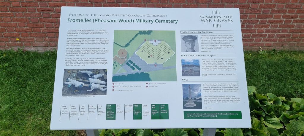 Quoting from the Commonwealth War Graves site “the cemetery contains a total of 250 Australian and British soldiers. 225 are Australians, of which 59 are unidentified, 2 are unidentified British soldiers and 23 are entirely unidentified Commonwealth soldiers. The 250 were recovered in 2009 from a number of mass graves located behind nearby Pheasant Wood, where they had been buried by the Germans following the disastrous battle of Fromelles on 19 and 20 July 1916.”