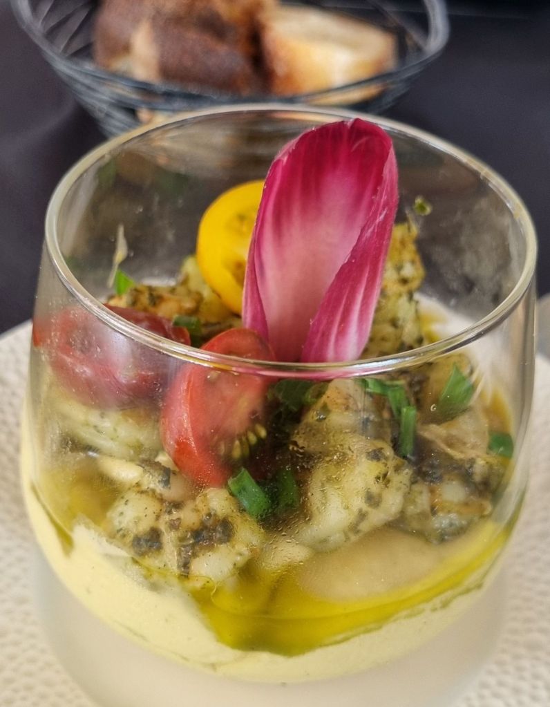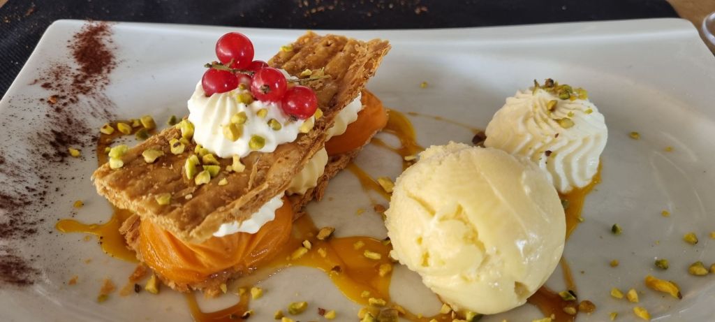 It proves a great choice yet again. Himself has goats cheese stuffed peppers to start then hake with leeks in a cream sauce split with citrus oil, followed by roasted apricot mille feuille. I differ only in the entree, selecting a twist on a prawn cocktail, served warm on a guacamole base. Accompanied by a crisp Bourgogne white, it’s a deliciously relaxing way to while away the afternoon.