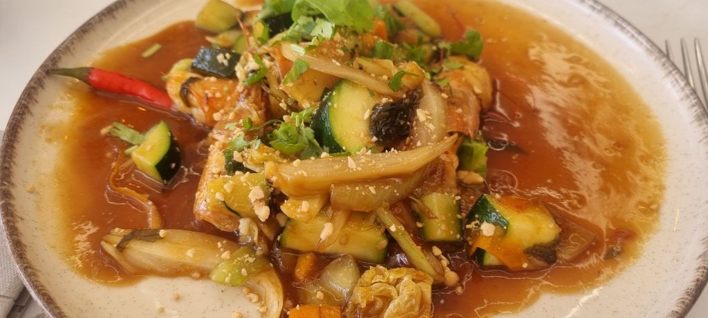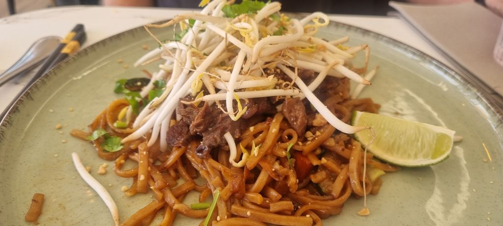 The following day, lunch comes with a bonus – Vietnamese fare. Yes!!! I practically skip there. We have spicy prawns and beef with noodles . Pork spring rolls with fresh herbs too, but again, inhaled with excitement before I remembered to photograph. There’s a raised eyebrow of amusement from our waiter when I order it spicy – the French are not fans of chili, it seems.