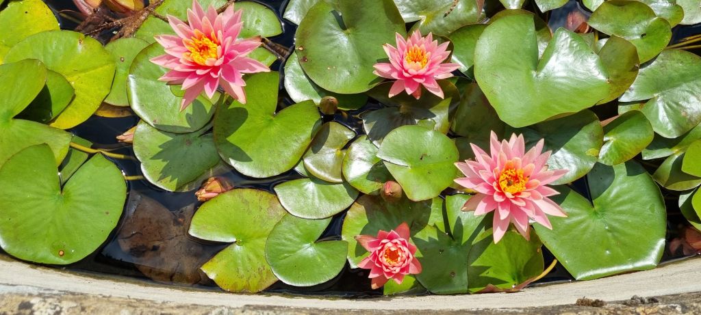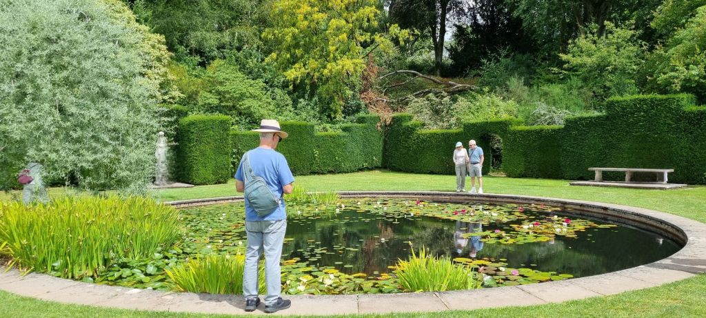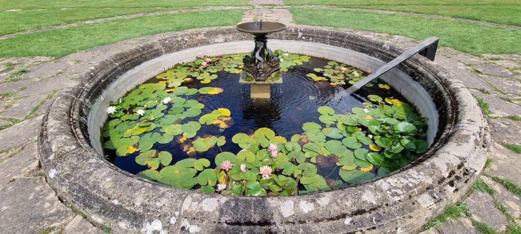 We see pretty water features with water lilies and the formal gardens that surround the house.
